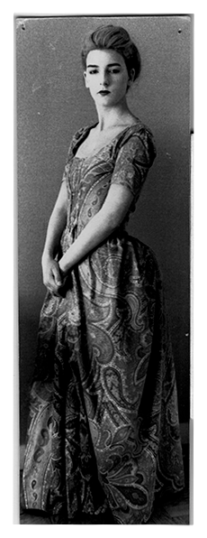 Avec le tissu qui recouvrait le canapé chez mes parents, du haut de mes 16 ou 17 ans, j’avais moulé, puis taillé sur la bête cette robe, patiemment cousue ensuite. Un coussin pour le popotin, du talc sur les cheveux, un retardateur et hop !